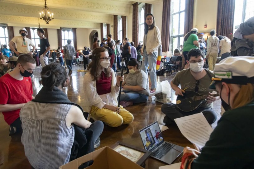 So just before midnight, the teams were invited into the main hall of the building. The judges gathered on a staircase and tried to explain a few rules, but the room grew loud, rowdy, chaotic. One student played an accordion, another was dressed as an armadillo.