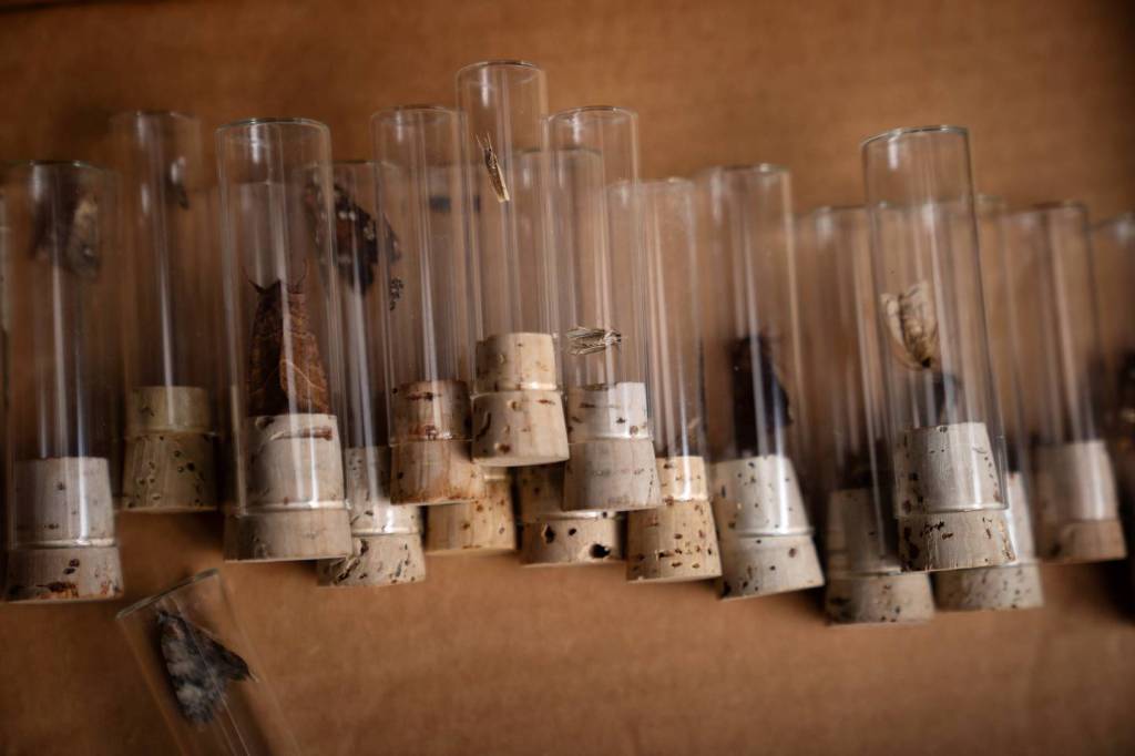 These are small moths, but also beetles, spiders, wasps — whatever wanders in. Some moths flutter upward to the net, some crawl along the cartons; Steffen sorts slowly, placing moths he doesn’t recognize in tubes, releasing moths he’s familiar with, about 99% of his catches. He works in silence, stopping to note a new species or unusual find. “Underwing,” he says, raising the camouflage dress of a moth and revealing orange knickers.