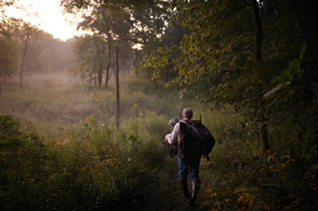 Just after Labor Day, Steffen, 68, moves quickly across McDonald Woods, stalking through its thigh-high grasses, stepping over its thin creeks. He carries 40 pounds of batteries on his back. He’s trailed by two younger Botanic Garden employees. He plants a trap, connects the UV light to a battery, tests sensors for brightness, then rushes silently to a new spot.